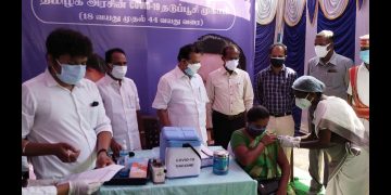 District 18 முதல் 44 வயது உட்பட்டவர்களுக்கு குருநாத் தடுப்பூசி செலுத்தும் சிறப்பு முகாமினை உயர்கல்வித்துறை அமைச்சர் முனைவர் க.பொன்முடி துவக்கி வைத்தார் . May 26, 2021